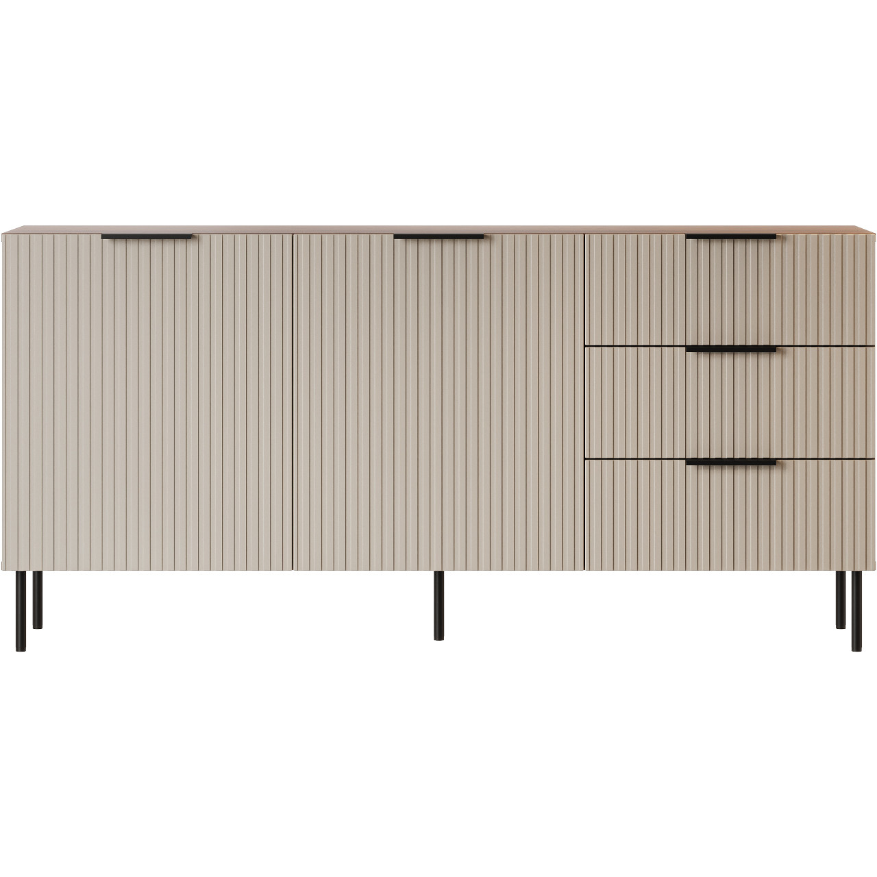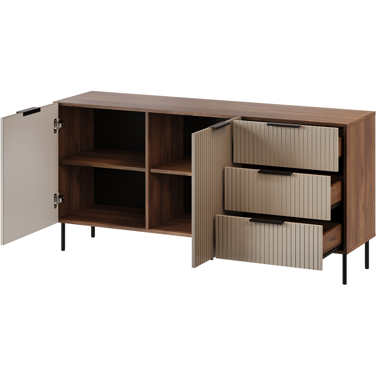 Komoda Almera typ 01 obsahuje tri zásuvky a dve dvierka, vo vnútri sú poličky.