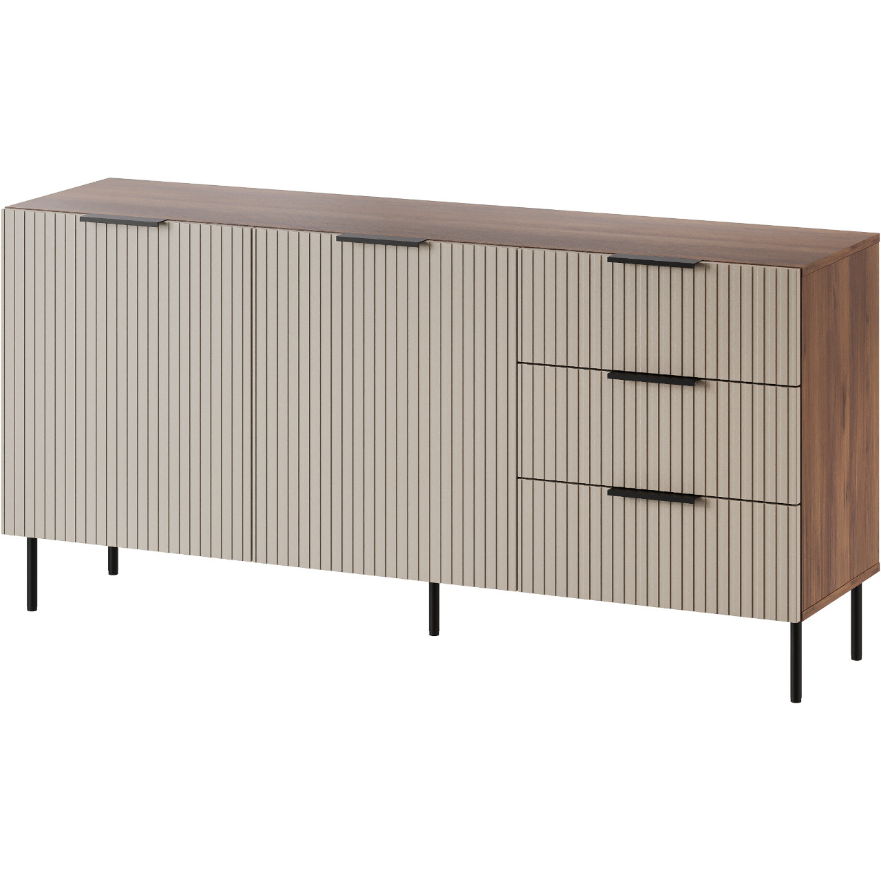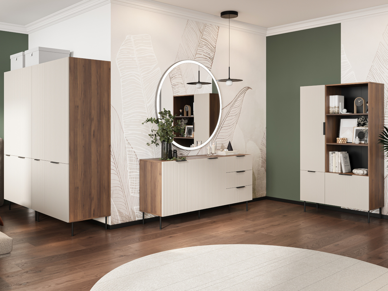 Elegantný sektorový nábytok Almera dostupný v modernej farebnej kombinácii orech warmia/kašmír. Korpus vo farbe orech warmia, frézované dvierka vo farbe kašmír a elegantné vysoké nožičky dodávajú tejto kolekcii výnimočnosť.