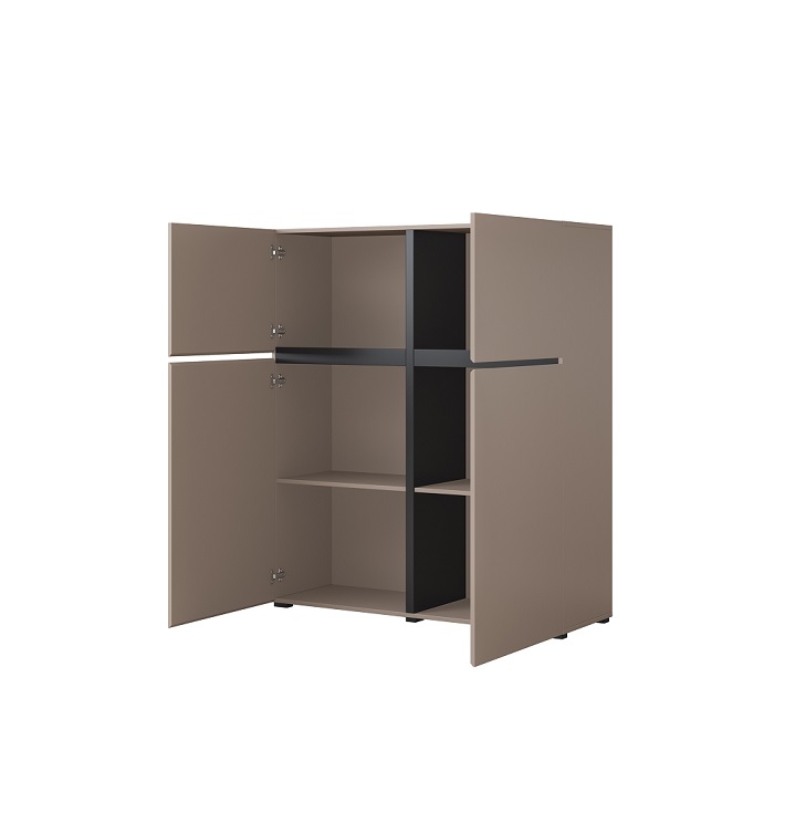 Komoda Cross 4D obsahuje štyri dvierka, vo vnútri sú poličky.