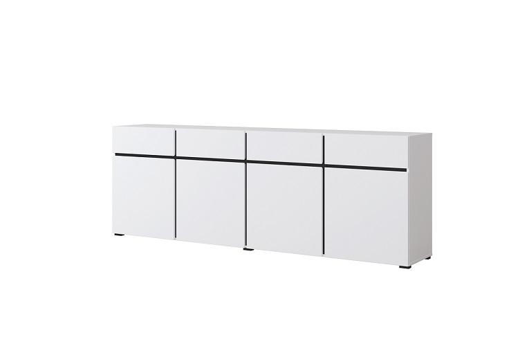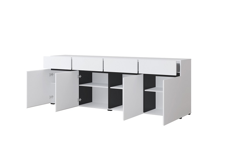 Komoda Cross 4D4S obsahuje štyri zásuvky a štyri dvierka, vo vnútri sú poličky.