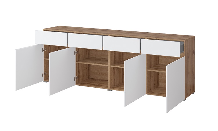 Komoda Cross 4D4S obsahuje štyri zásuvky a štyri dvierka, vo vnútri sú poličky.