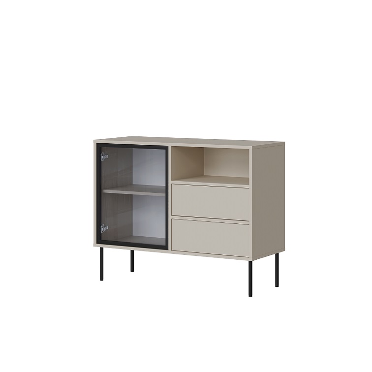 Komoda Domi 100 obsahuje dve zásuvky, presklené dvierka a otvorenú policovú časť.