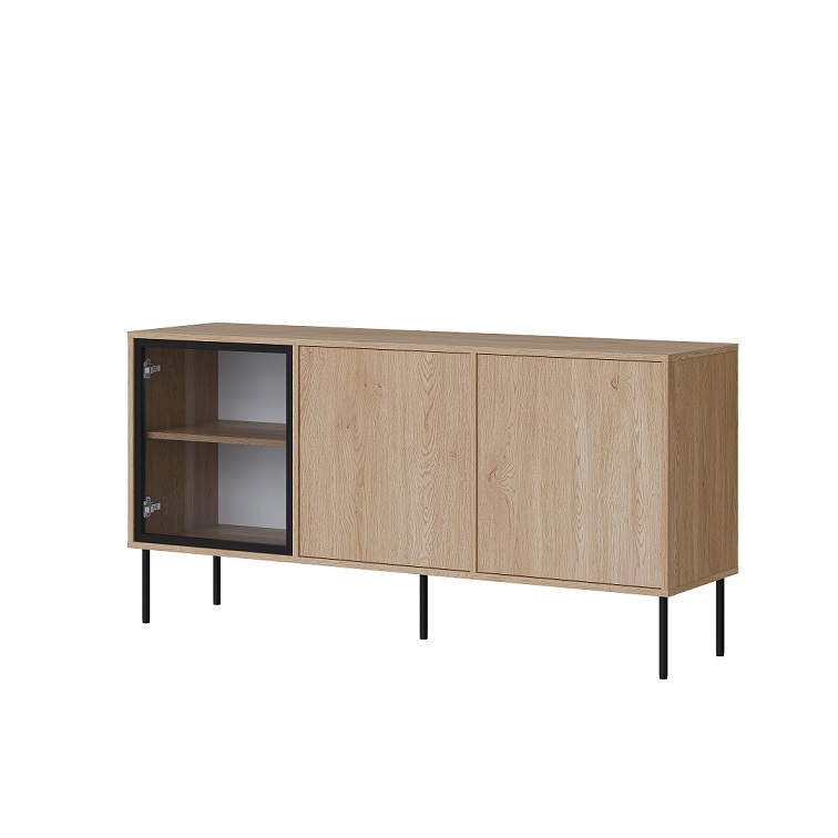 Komoda Domi 150 obsahuje dve plné a jedny presklené dvierka, vo vnútri sú poličky.