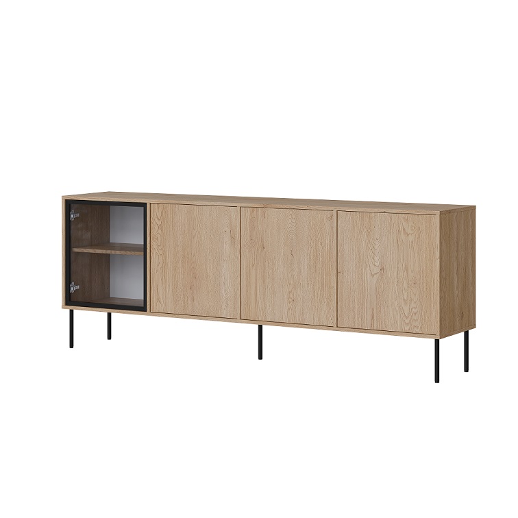 Komoda Domi 200 obsahuje tri plné a jedny presklené dvierka, vo vnútri sú poličky.