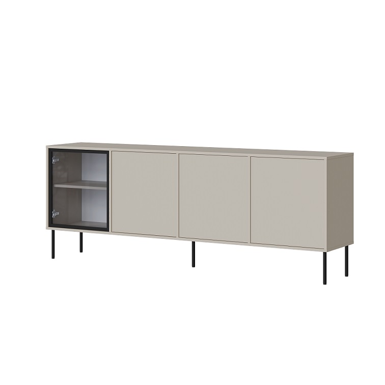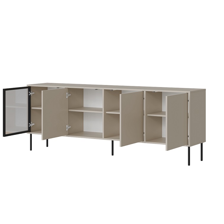 Komoda Domi 200 obsahuje tri plné a jedny presklené dvierka, vo vnútri sú poličky.