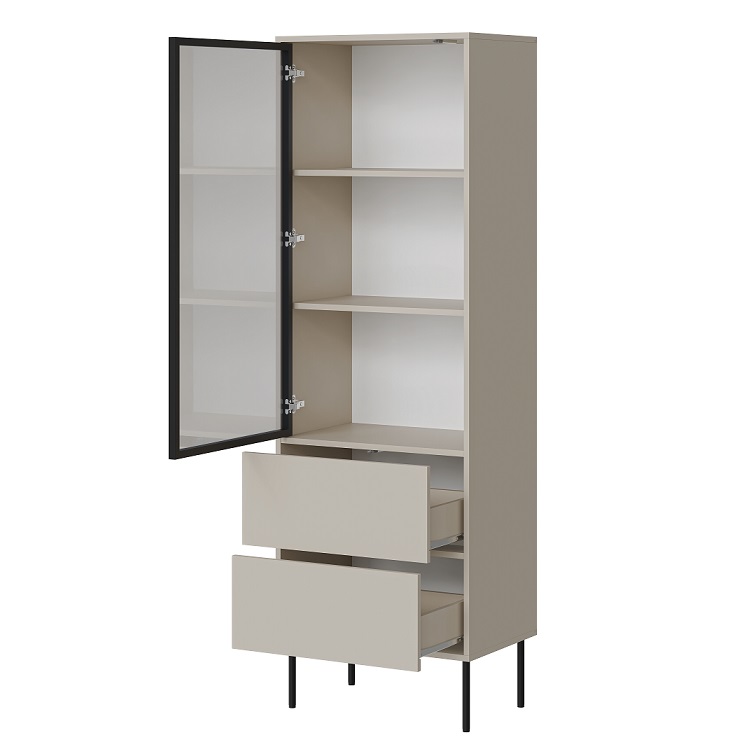 Vitrína Domi obsahuje dve zásuvky a presklené dvierka, vo vnútri sú poličky.