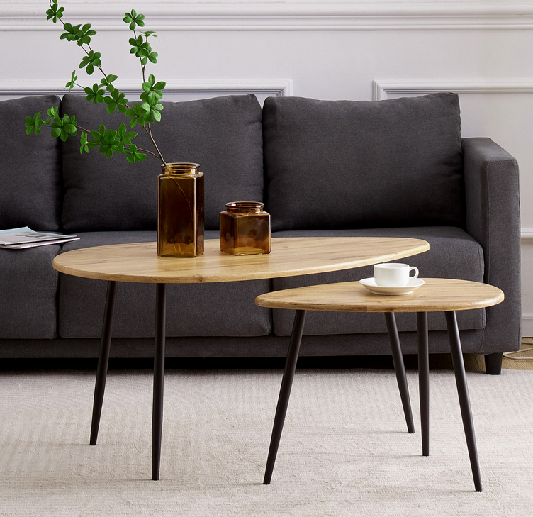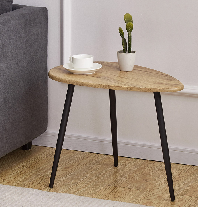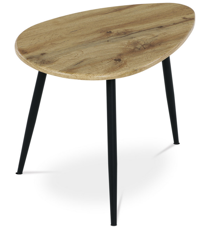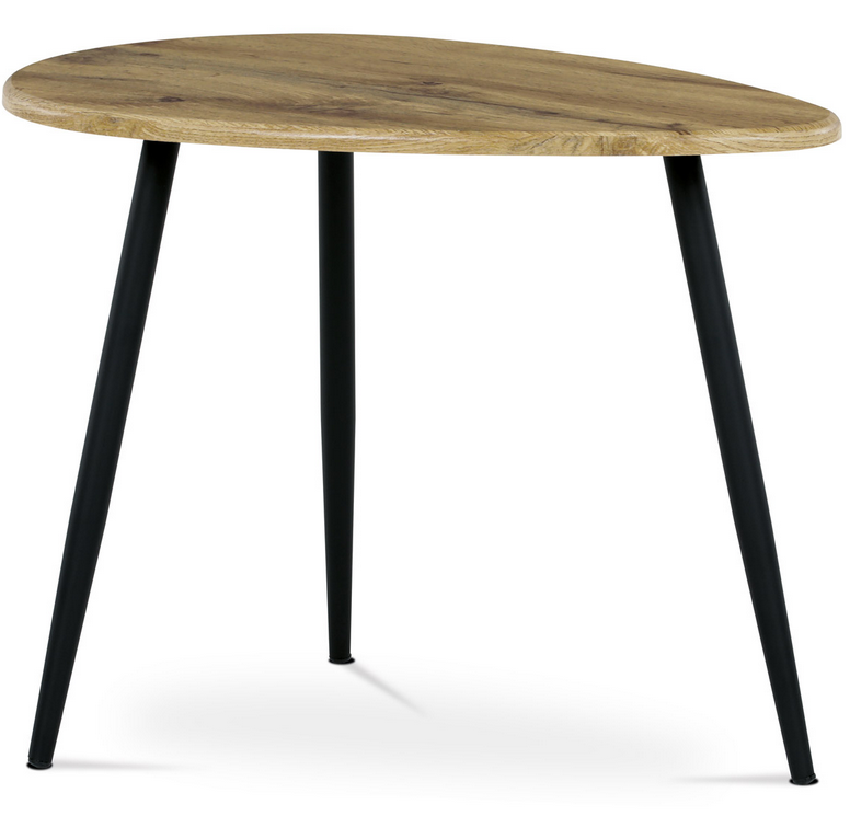 Moderný konferenčný stolík AF-3011 OAK v minimalistickom štýle s atypickou stolovou doskou vo farbe divoký dub s čiernou kovovou podnožou. Materiál: MDF+kov, farebné prevedenie: divoký dub/čierna. Možnosť použiť do setu s konferenčným stolíkom AF-3012 OAK z našej ponuky.