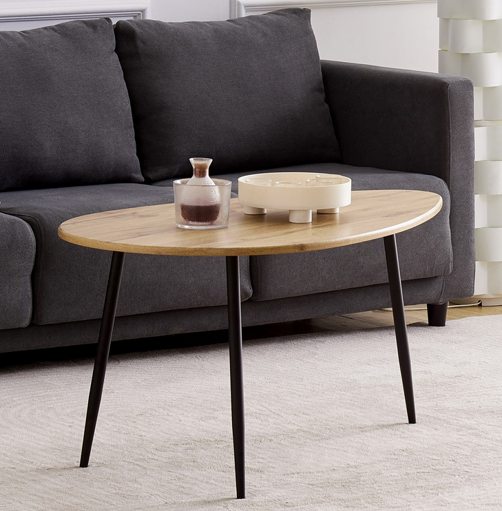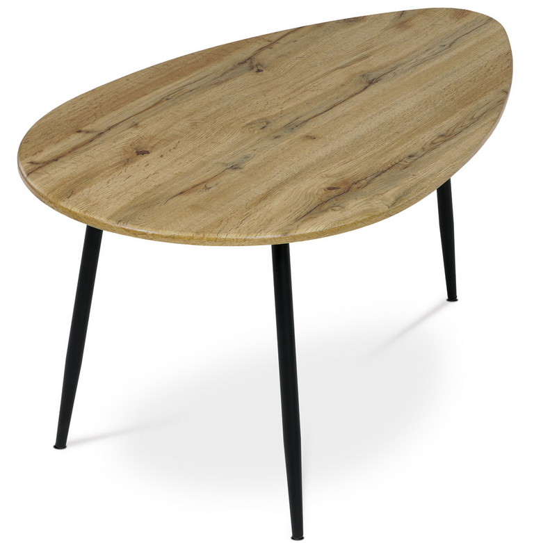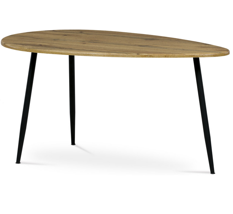 Moderný konferenčný stolík AF-3012 OAK v minimalistickom štýle s atypickou stolovou doskou vo farbe divoký dub s čiernou kovovou podnožou. Materiál: MDF+kov, farebné prevedenie: divoký dub/čierna. Možnosť použiť do setu s konferenčným stolíkom AF-3011 OAK z našej ponuky.