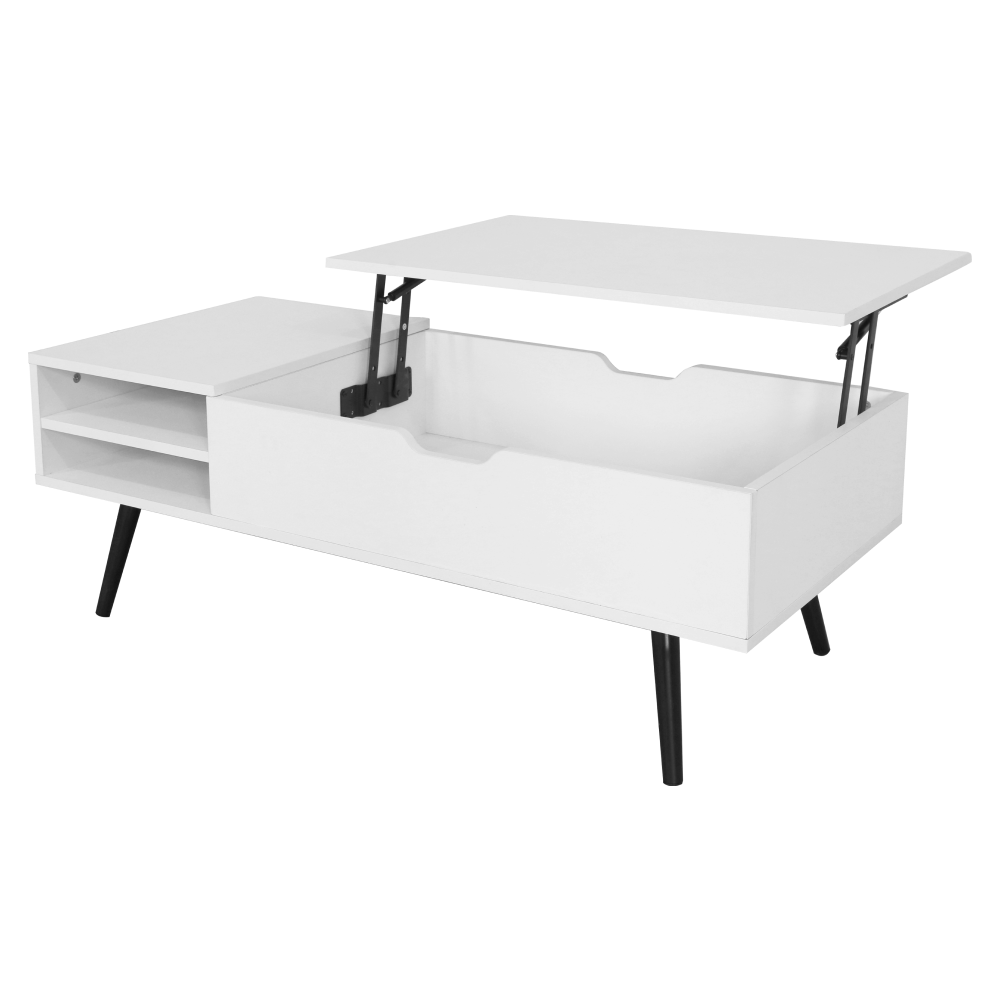 Dizajnový konferenčný stolík Aralyn s výškovo nastaviteľným stolovým plátom, čiernymi kovovými nožičkami a s praktickým úložným priestorom vo farbe biela matná. Materiál: MDF laminovaná+kov, farebné prevedenie: biela matná/čierna