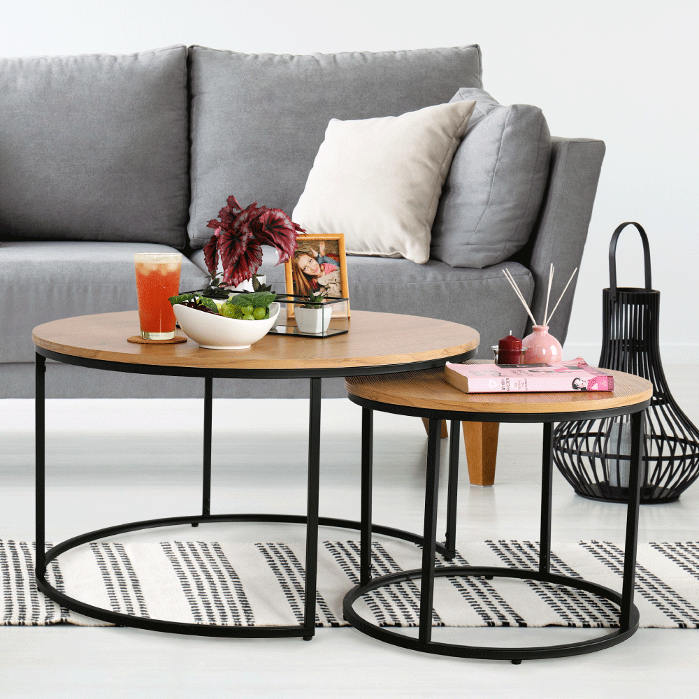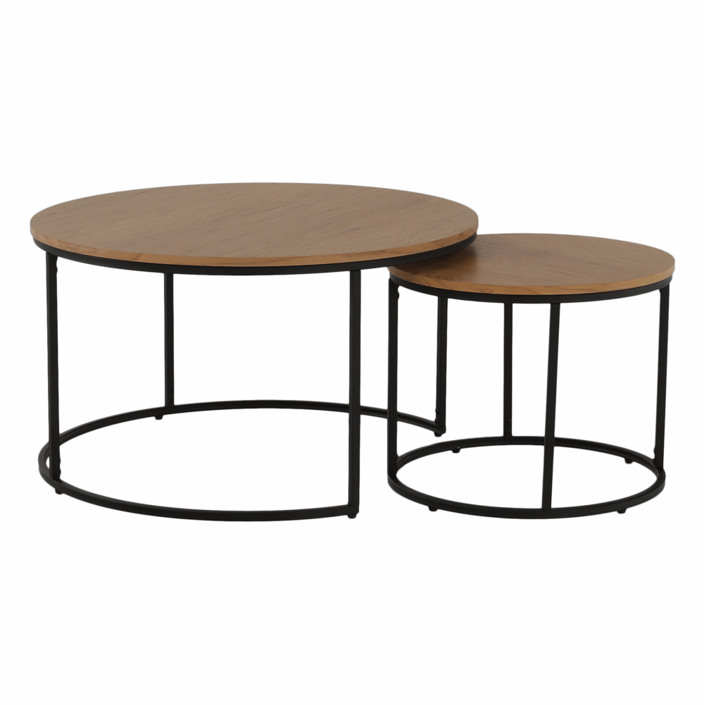 Set dvoch konferenčných stolíkov Iklin vo farbe dub s čiernou kovovou podnožou. Materiál: MDF+kov, farebné prevedenie: dub/čierna