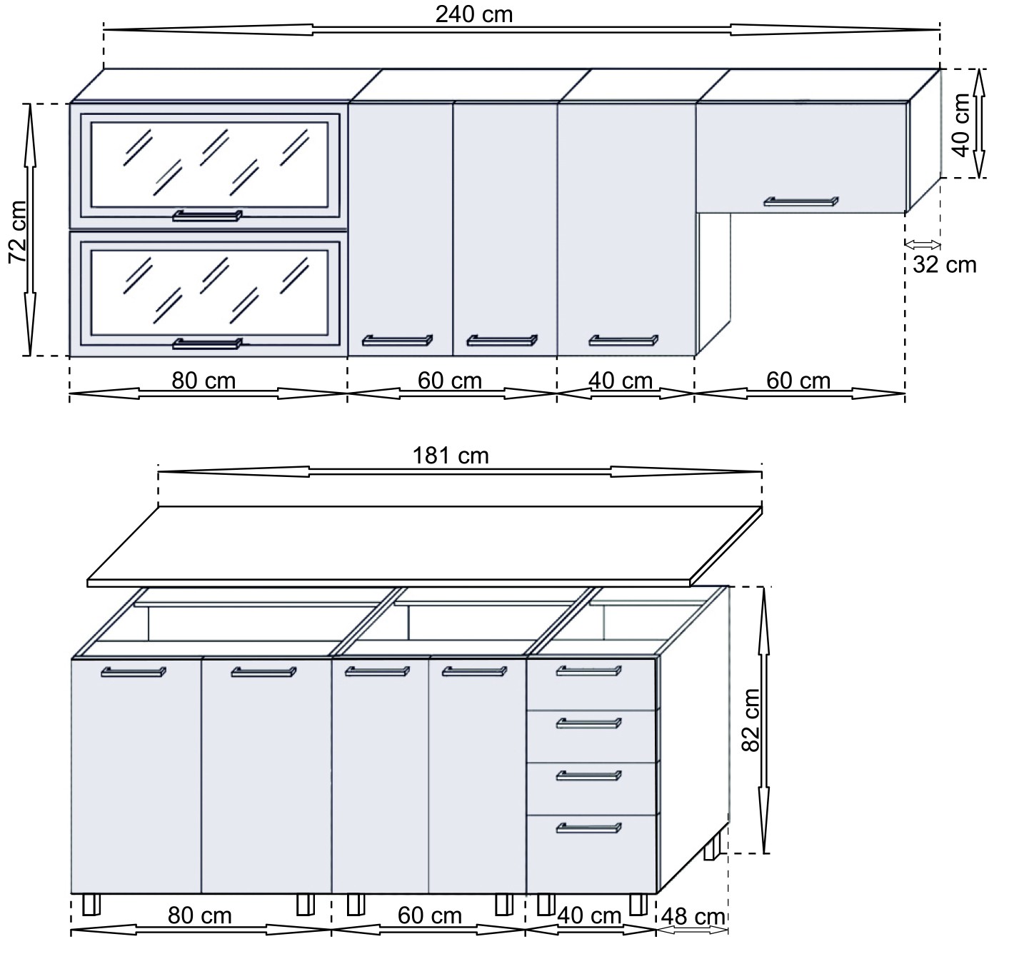 • RozmeryHorné skrinky: 240 cm (dĺžka)