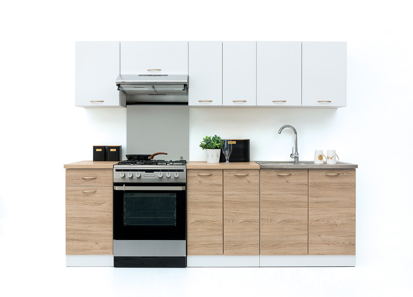 Moderná kuchynská linka Sonia 2 dostupná vo farebnej kombinácii biela/dub bariqque. Kuchynská linka obsahuje tri spodné a štyri horné skrinky, v ktorých je dostatok miesta na uloženie všetkých potrebných vecí. Drezová skrinka neobsahuje pracovnú dosku. Kuchynská linka je dodávaná v demontovanom stave. V cene kuchynskej linky nie je zahrnutý drez a spotrebiče.