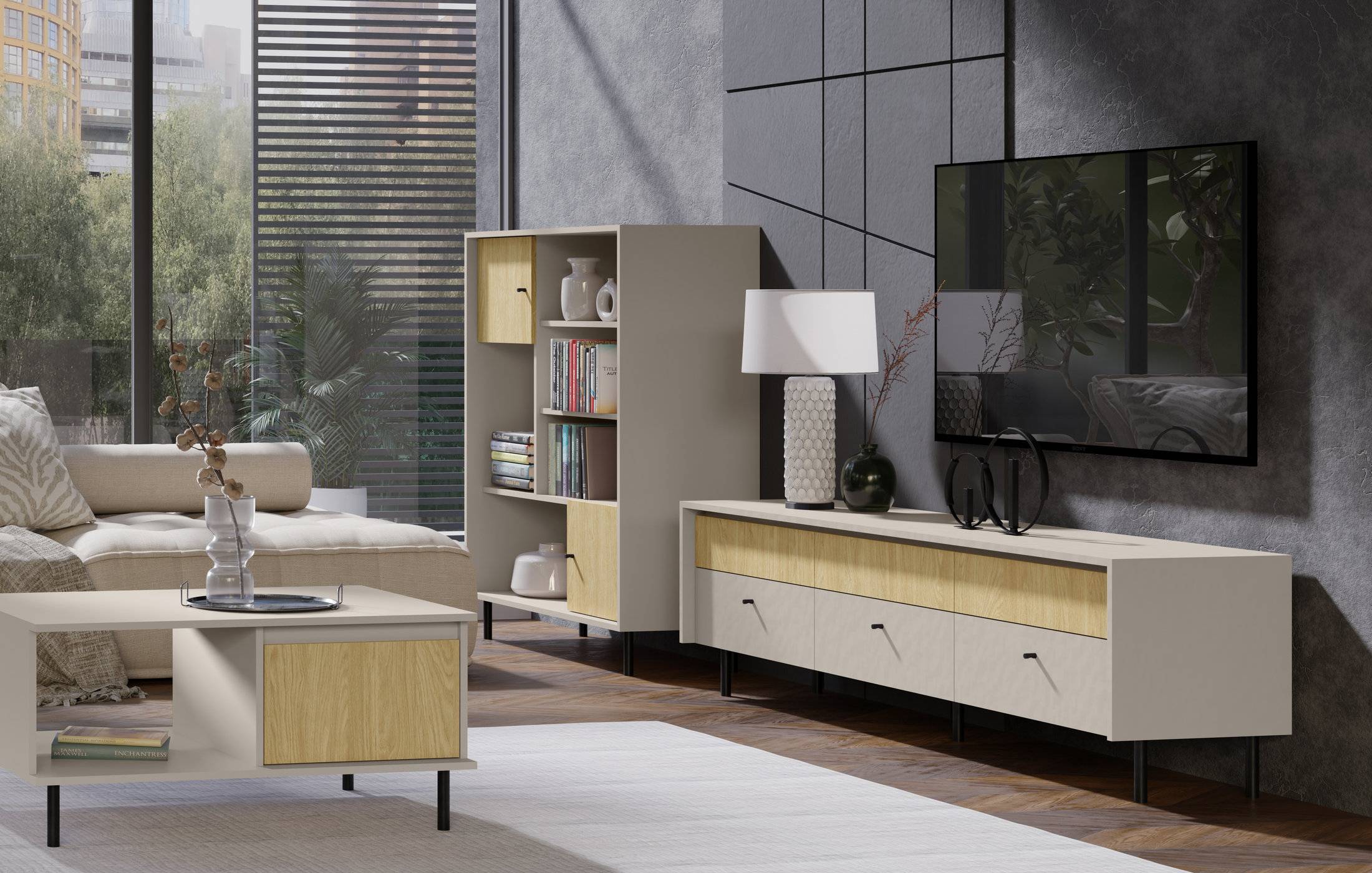 Elegantný sektorový nábytok Malta dostupný v modernej farebnej kombinácii pieskovo béžová/dub olejovaný. Minimalistické čierne úchytky, obľúbená farebná kombinácia béžovej a dubu a elegantné nožičky v čiernej farbe dodávajú tejto kolekcii jedinečnosť.
