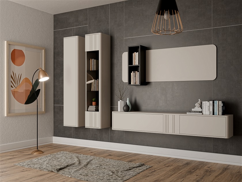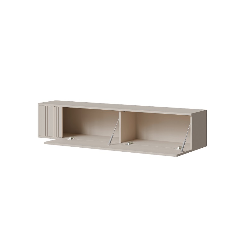 Dizajnový závesný sektorový nábytok Philippe dostupný vo farbe kašmír matný. Moderné bezúchytkové otváranie, jemné frézovanie, hladké dvierka a zaoblené hrany dodávajú tejto kolekcii výnimočnosť a eleganciu.