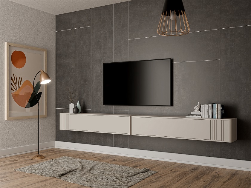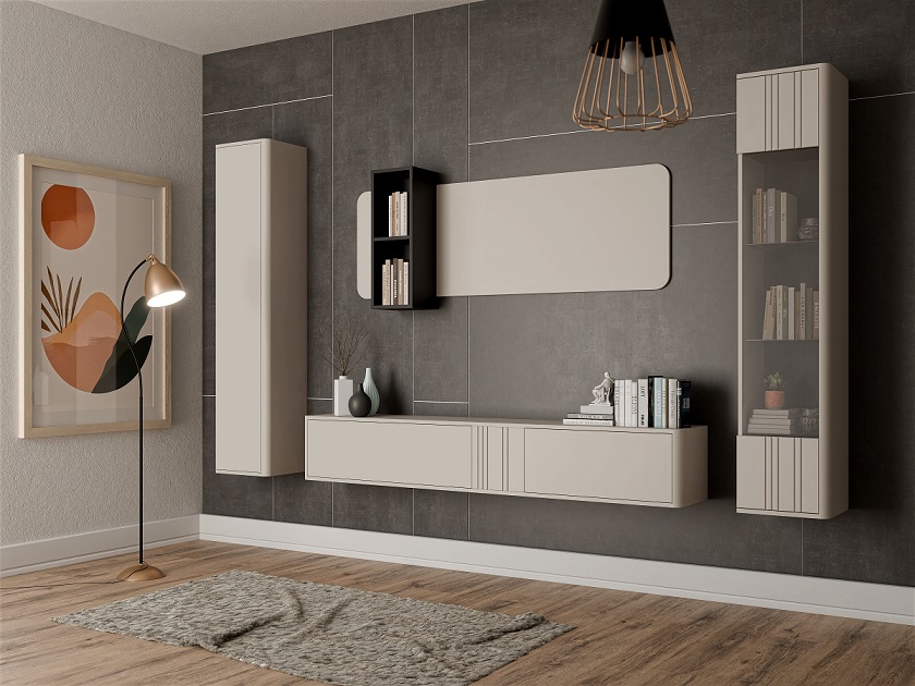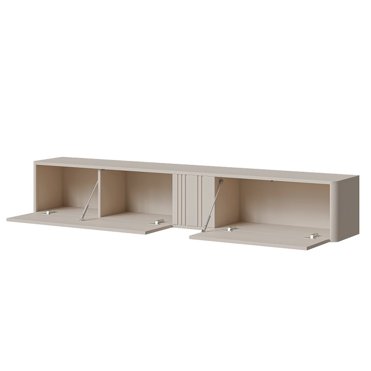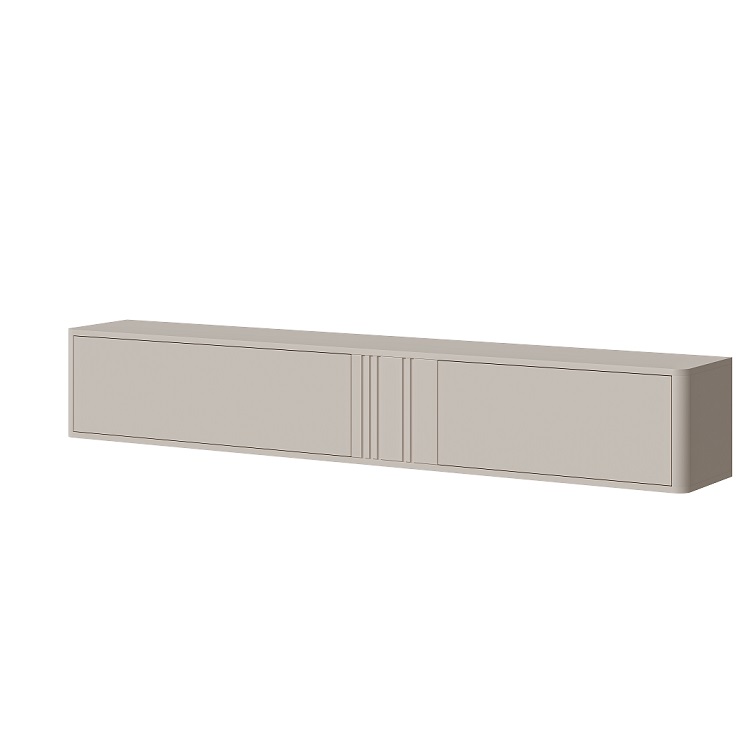Dizajnový závesný sektorový nábytok Philippe dostupný vo farbe kašmír matný. Moderné bezúchytkové otváranie, jemné frézovanie, hladké dvierka a zaoblené hrany dodávajú tejto kolekcii výnimočnosť a eleganciu.
