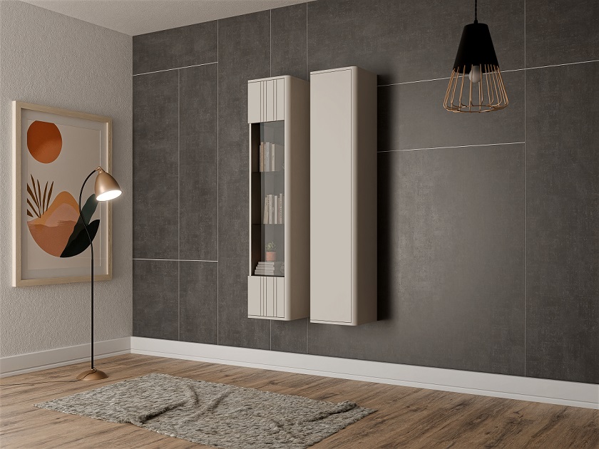 Dizajnový závesný sektorový nábytok Philippe dostupný vo farbe kašmír matný. Moderné bezúchytkové otváranie, jemné frézovanie, hladké dvierka a zaoblené hrany dodávajú tejto kolekcii výnimočnosť a eleganciu.