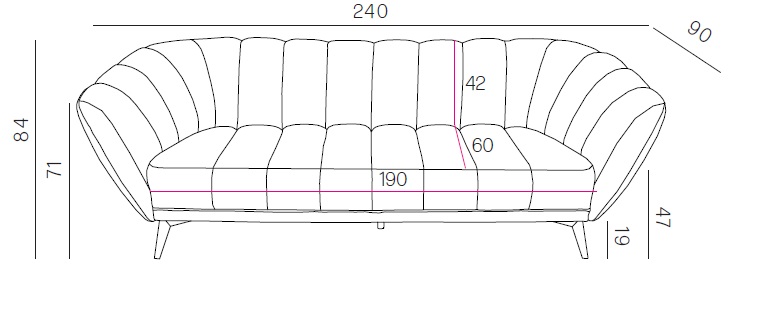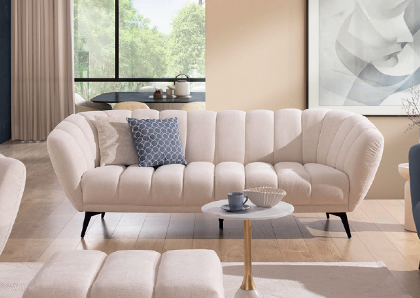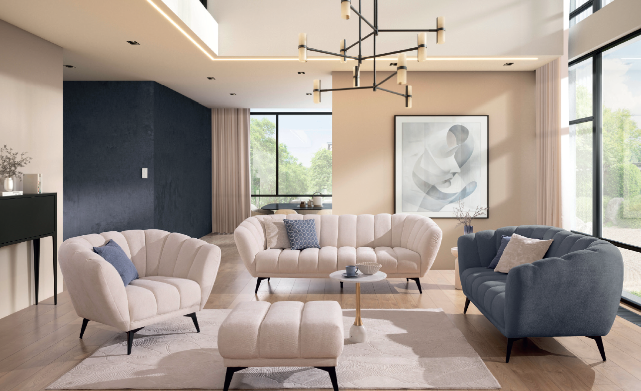 Elegantná kolekcia Valetti s moderným dizajnovým prešívaním pozostáva z dvoch pohoviek, kresla a taburetky. Kolekcia má kovové nožičky v čiernej farbe, výška nožičiek je 19 cm.