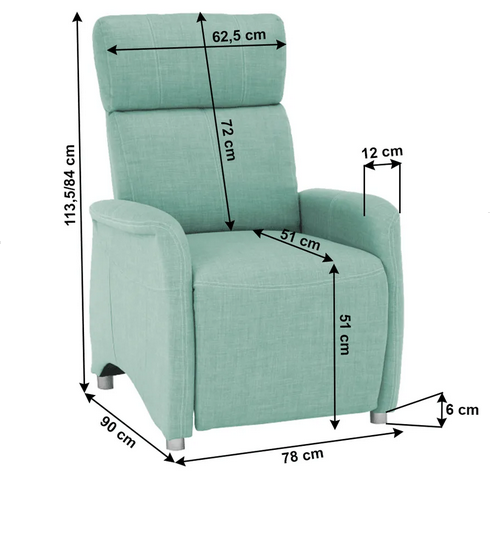 Relaxačné kreslo Forest v jemnej mentolovej farbe s manuálnym polohovaním. Dodávané v demonte. Rozmery: 78 x 90 x 113,5 cm(š.h.v)