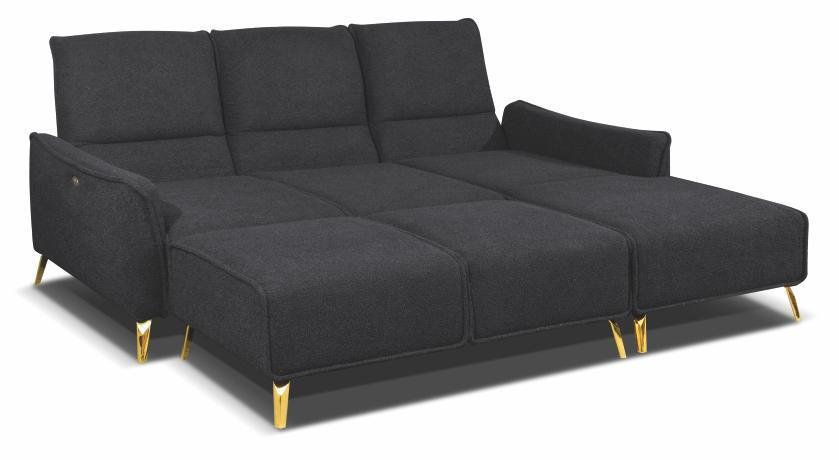 Elegantná sedacia súprava Modern v minimalistickom štýle s kvalitnými kovovými nohami dostupnými v troch farbách- čierna, chróm a zlatá. Sedacia časť je vyrobená z kvalitnej HR peny v kombinácii s vlnitou pružinou, ktorá je zárukou trvácnosti a komfortného sedenia. Má nastaviteľné chrbtové opierky pre vaše maximálne pohodlie. Sedacia súprava je bez funkcie rozkladu na spanie a bez úložného priestoru, priestor na spanie je možné získať priložením taburetky D. Veľkosť plochy na spanie po priložení taburetky je 210 x 158 cm. Zostava obsahuje elektricky ovládateľnú výsuvnú podložku na nohy. Veľký výber poťahových látok vám poskytuje možnosť si prispôsobiť vzhľad sedacej súpravy podľa vašich predstáv. Sedaciu súpravu je možné doplniť o taburetku.