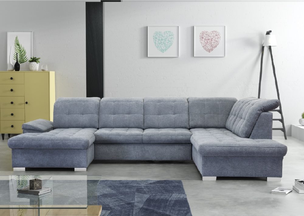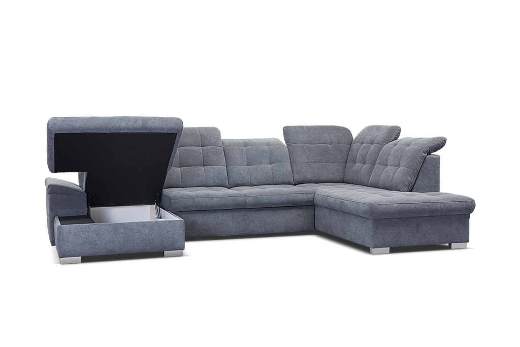 Moderná rozkladacia sedacia súprava Nicole v tvare U s úložným priestoromSedacia súprava má nastaviteľné opierky hlavy pre vaše maximálne pohodlie.  Sedacia súprava je dostupná v ľavom, aj v pravom prevedení. Úložný priestor poskytuje dostatočné miesto pre vaše veci. Po rozložení sedačky vznikne plocha na spanie 130 x 269 cm, ktorá výborne poslúži na občasné spanie. Sedacia súprava je čalúnená aj zo zadnej časti, čo ju umožňuje umiestniť aj v priestore.