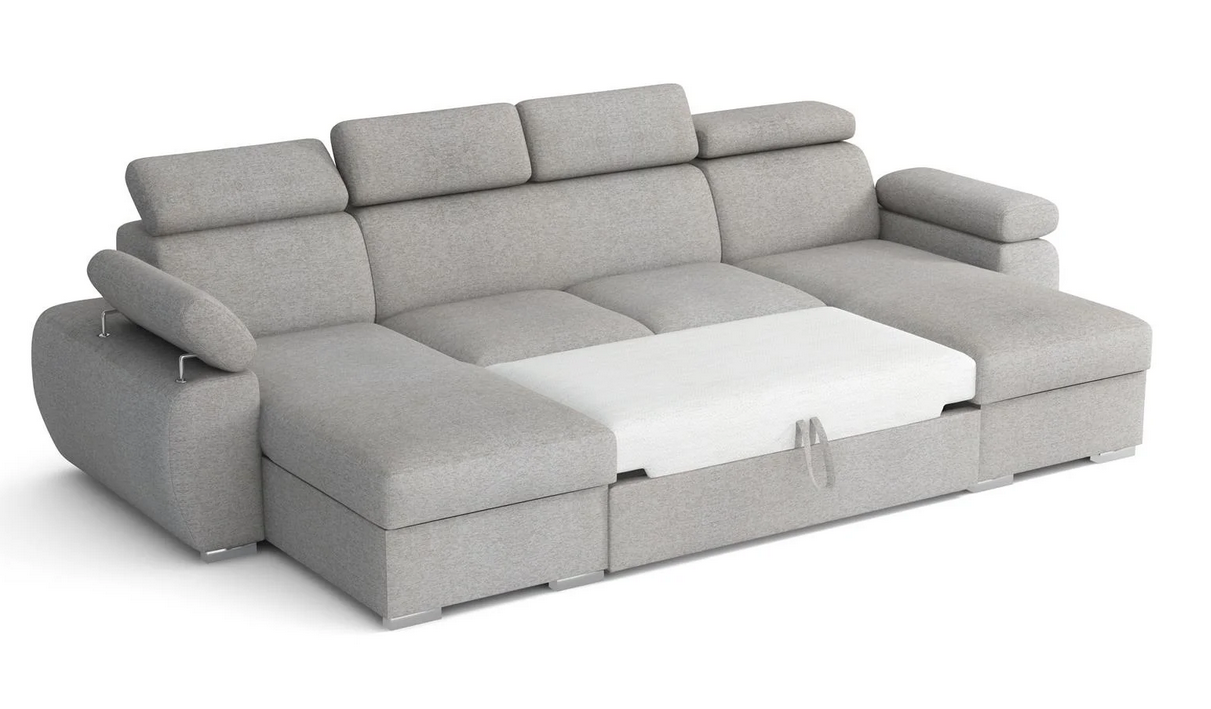 Moderná sedacia súprava Plaza v tvare U s polohovateľnými opierkami na hlavu a na ruky. Sedacia súprava je rozkladacia, po rozložení vznikne plocha na spanie 130 x 272 cm. Dva veľké úložné priestory poslúžia na uloženie vašich vecí.