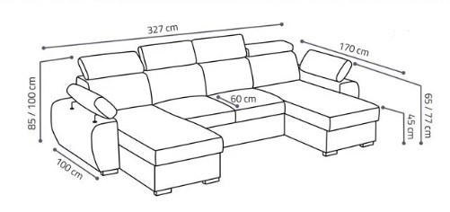 Moderná sedacia súprava Plaza v tvare U s polohovateľnými opierkami na hlavu a na ruky. Sedacia súprava je rozkladacia, po rozložení vznikne plocha na spanie 130 x 272 cm. Dva veľké úložné priestory poslúžia na uloženie vašich vecí.