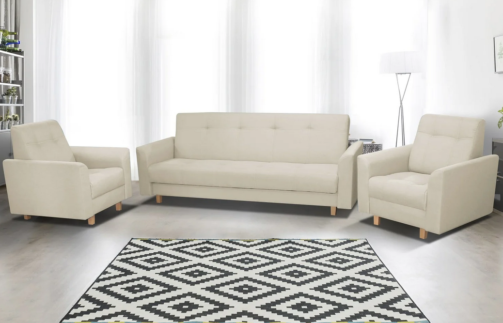 Moderná sedacia súprava Saga v zostave 3+1+1 s drevenými nožičkami v elegantnom krémovom farebnom prevedení. Sedacia súprava je rozkladacia, po rozložení vznikne plocha na spanie 120 x 190 cm. Trojsed obsahuje aj úložný priestor.