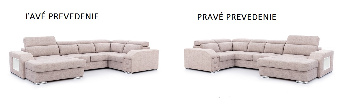 Sedacia súprava Tulon má polohovateľné opierky na hlavu, funkciu rozkladania na spanie, úložný priestor, otvorenú policu a zásuvku na boku v opierke na ruky. Samozrejmosťou je výber poťahovej látky a pravého a ľavého prevedenia. Sedacia súprava je čalúnená aj zo zadnej časti, preto je možné umiestniť ju do priestoru.