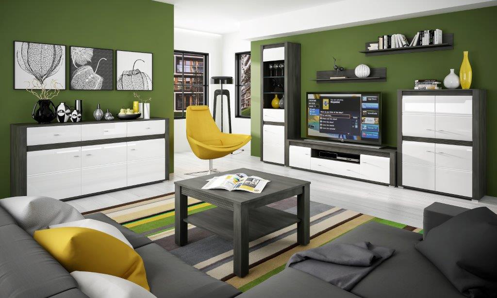 Sevilla to sú čisté tvary s elegantným frezovaním. Príjemný kontrast Nórskej borovice čiernej v kombinácii s bielym vysokým leskom. Kvalitné MDF dvierka s chrómovými úchytkami. Pomocou nábytku Sevilla zaridíte obývaciu izbu alebo jedáleň, k dispozícii sú komody, skrine, tv stolíky, police. K vybraným prvkom je možné zakúpiť LED osvetlenie.