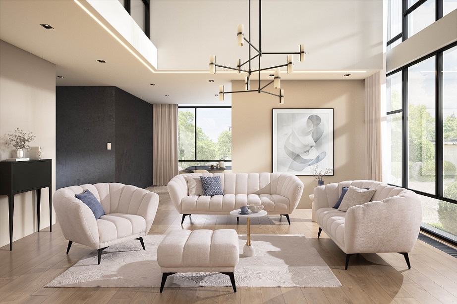 Elegantná kolekcia Valetti s moderným dizajnovým prešívaním pozostáva z dvoch pohoviek, kresla a taburetky. Kolekcia má kovové nožičky v čiernej farbe, výška nožičiek je 19 cm.